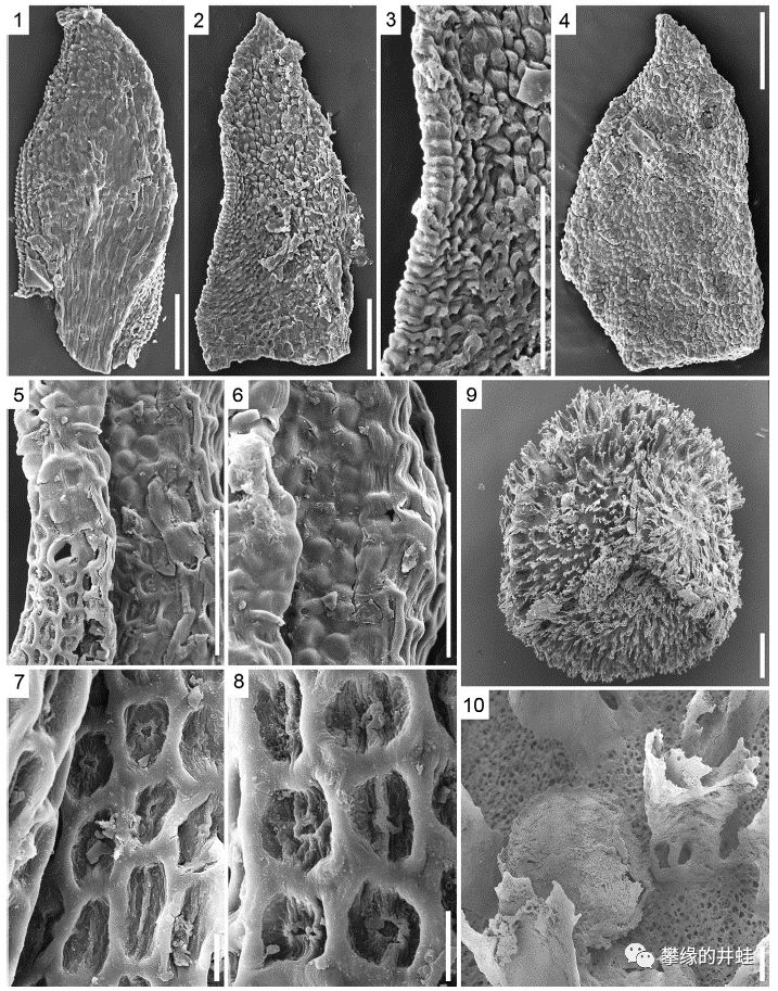 南极洲查尔斯王子山脉(Prince Charles Mountains)发现的晚二叠世草本石松Paurodendron stellatumsp化石和复原图。这是一种非常矮小的植物(复原图标尺长度1毫米),像苔藓一样匍匐在地表生长。在它的化石中间,还发现了一些其他石松类的大孢子Singhisporites hystrix(图9)。图片来源自[4]。