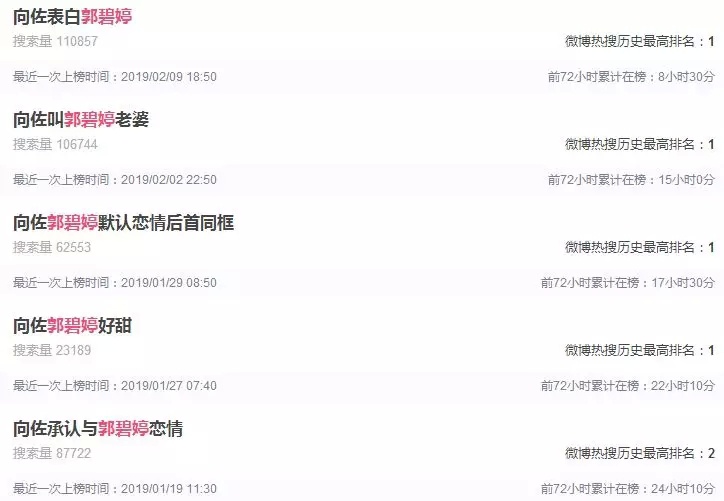 向佐和郭碧婷这一对的糖吃到现在,不知道大家发现没有,他俩从初识到订婚,几乎全程都被热搜直播了。