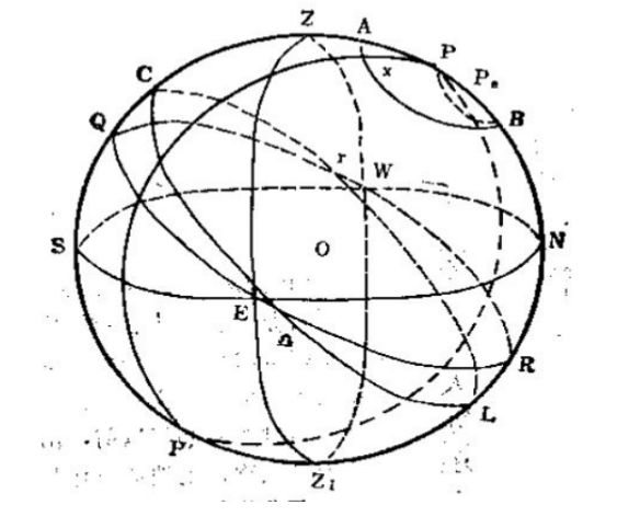 0 观察者的位置NESW 地平面ZS Z'N 子午圈EQWR 二十八宿天球赤道圈(或赤道平面)r、Ω、C、L 春分、秋分、夏至、冬至点X 北极星(或太乙)CΩQ黄赤交角=23"27,即地球赤道与地球轨道交角N、E、S、W 北、东、南、西Z、Z' 天顶、天底P'、P、Pe 天球南、北极、黄极ZEZ1W 卯酉圈rCΩL 太阳视远动黄道圈(或黄道平面)XAB 赤纬圈(或太乙日游圈)SEQ地平赤道交角(据观察者所在纬度不同而变化)