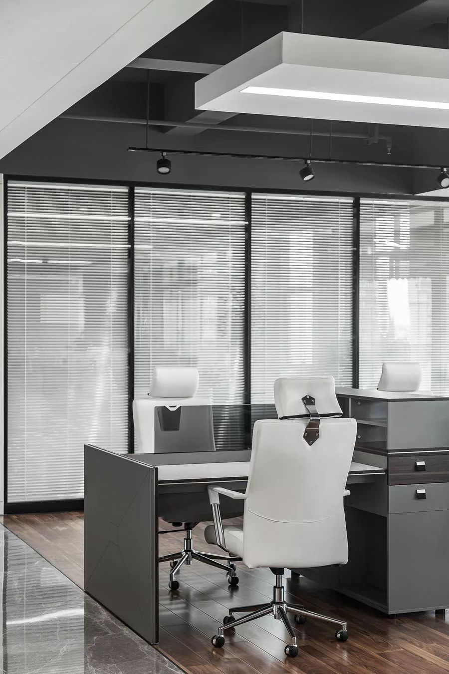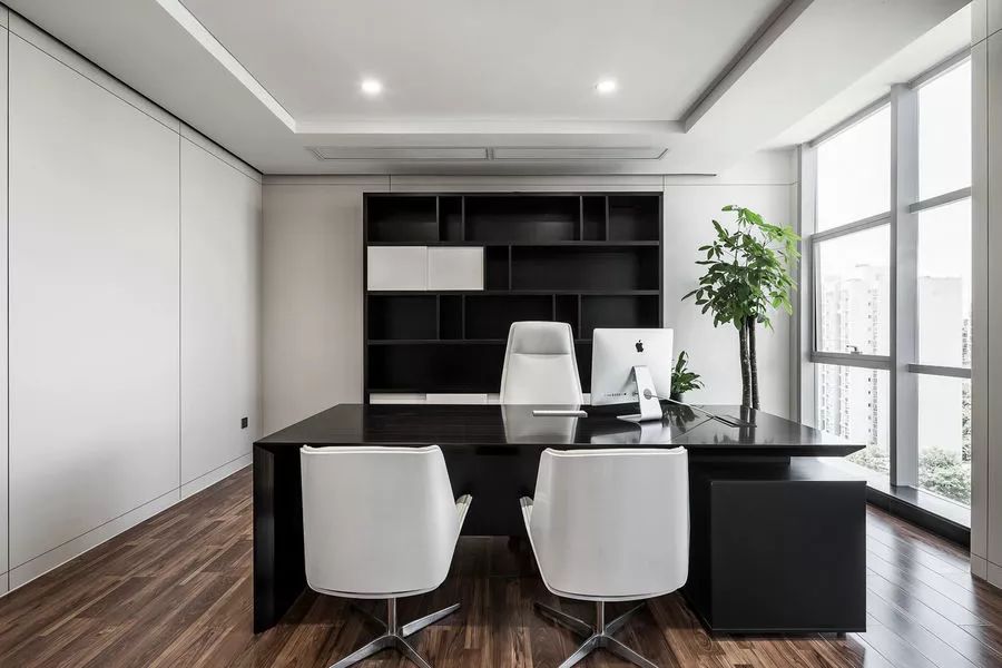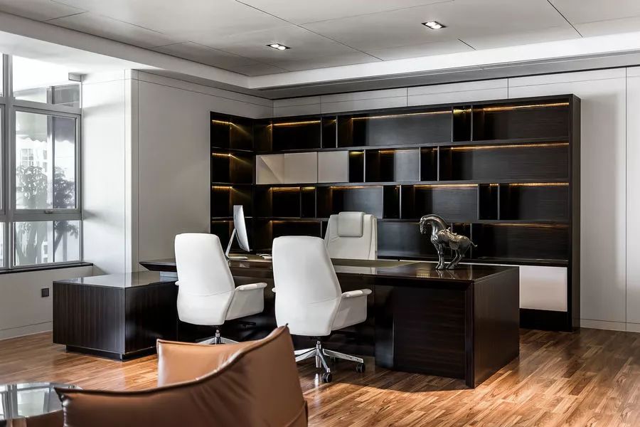 董事长办公室整天设计凸显大气的风格,办公家具选择黑色柜子及大的办公桌子,整体布局简约大方。