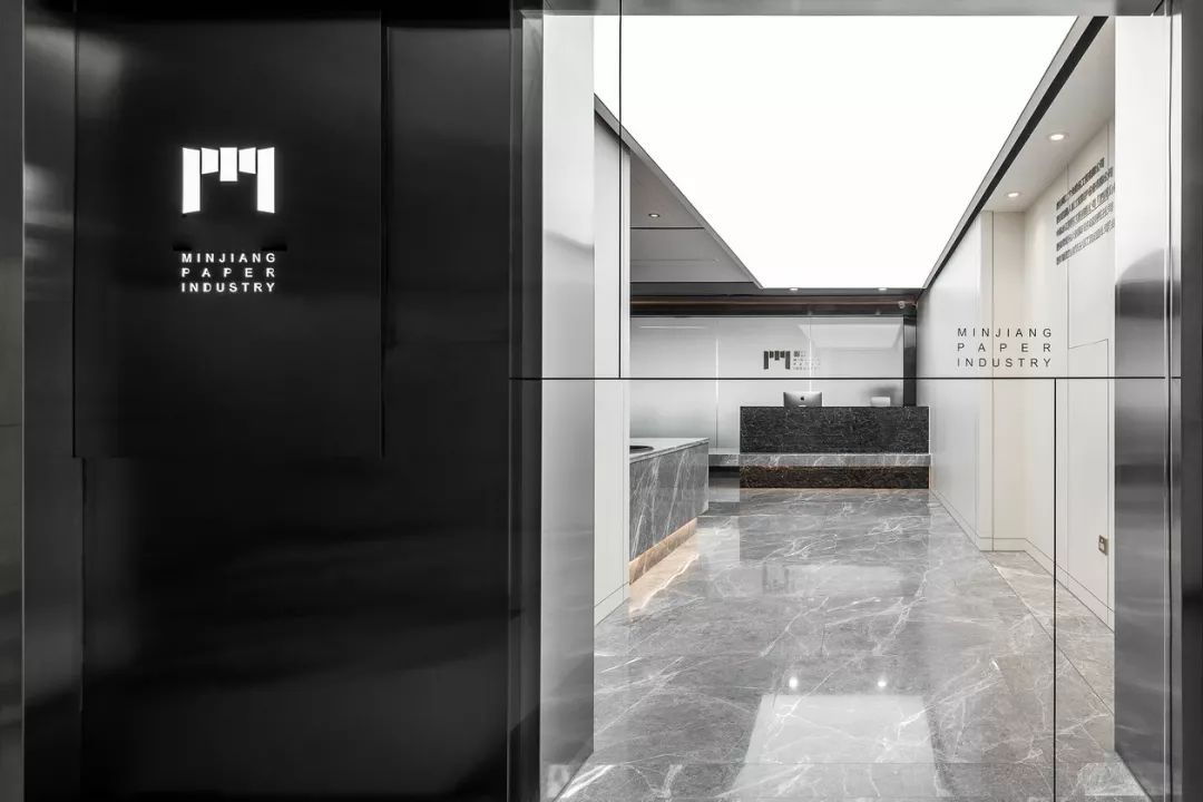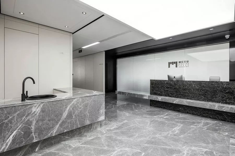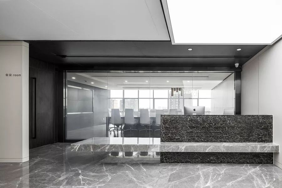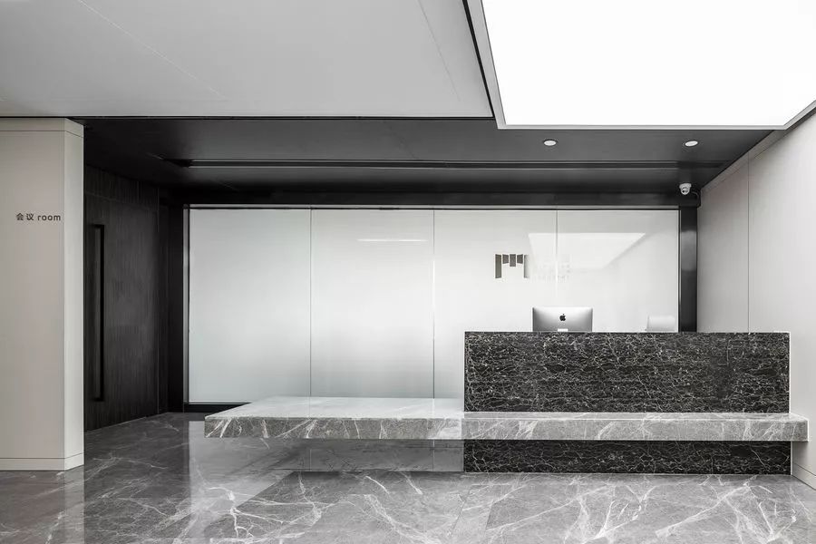 公司门厅,黑色的不锈钢材质门框,留有企业logo展示区域,非常醒目。从门口通过玻璃门透望前台,黑灰色大理石台面与灰色石材地面相映衬,彰显了企业大气的格调。