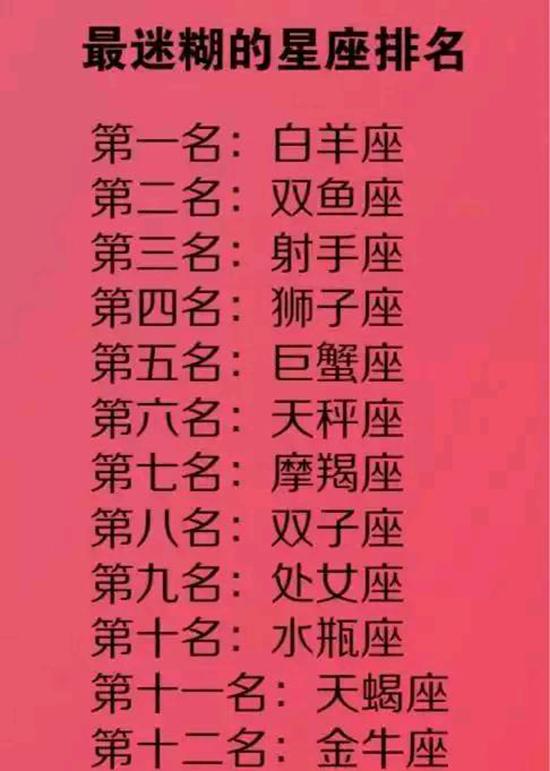 最迷糊的星座排名,第一名:白羊座,第二名:双鱼座,第三名:射手座,第四名:狮子座,第五名:巨蟹座,第六名:天秤座,第七名:摩羯座,第八名:双子座,第九名:处女座,第十名:水瓶座,第十一名:天蝎座,第十二名:金牛座 。