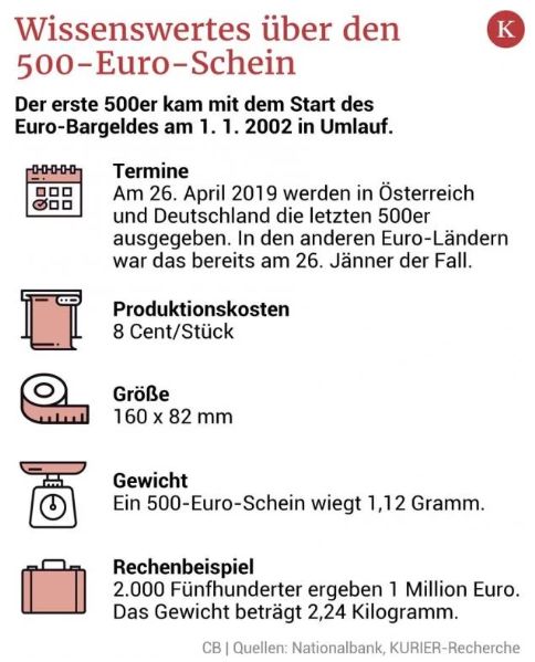 关于500欧元的小知识:奥地利和德国最后的500欧元纸币2019年4月26日发行,其余欧元国家已于1月26日停止发行,2000张500欧元纸币价值一百万欧元,重量仅2.24公斤
