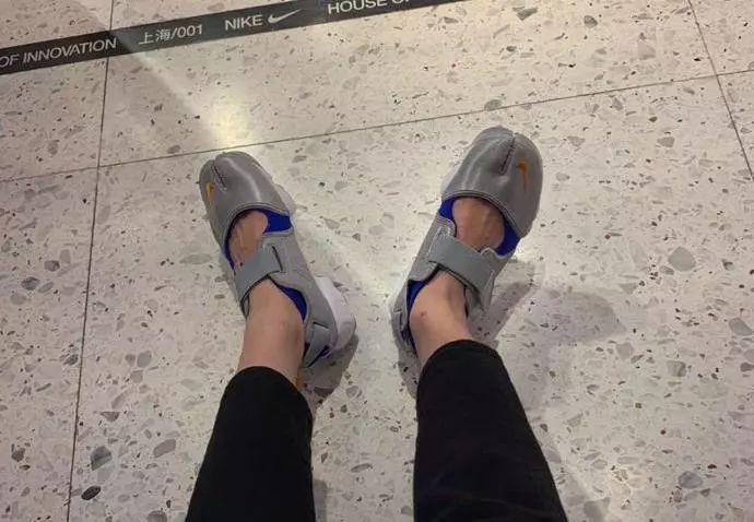这款分趾凉鞋,被誉为是耐克史上最特别的凉鞋,虽然去年也出过一款,但是今年这款更是特别。鞋型跟老式布鞋有一点相似,还带着鞋带扣,鞋面是超级透气的布面设计,鞋底采取的是水晶鞋底,脚感一流。整体给人的感觉丑萌丑萌,但是上脚之后却是帅气又个性,分脚趾的地方也不会有什么不适的感觉,脚感更是不输椰子。