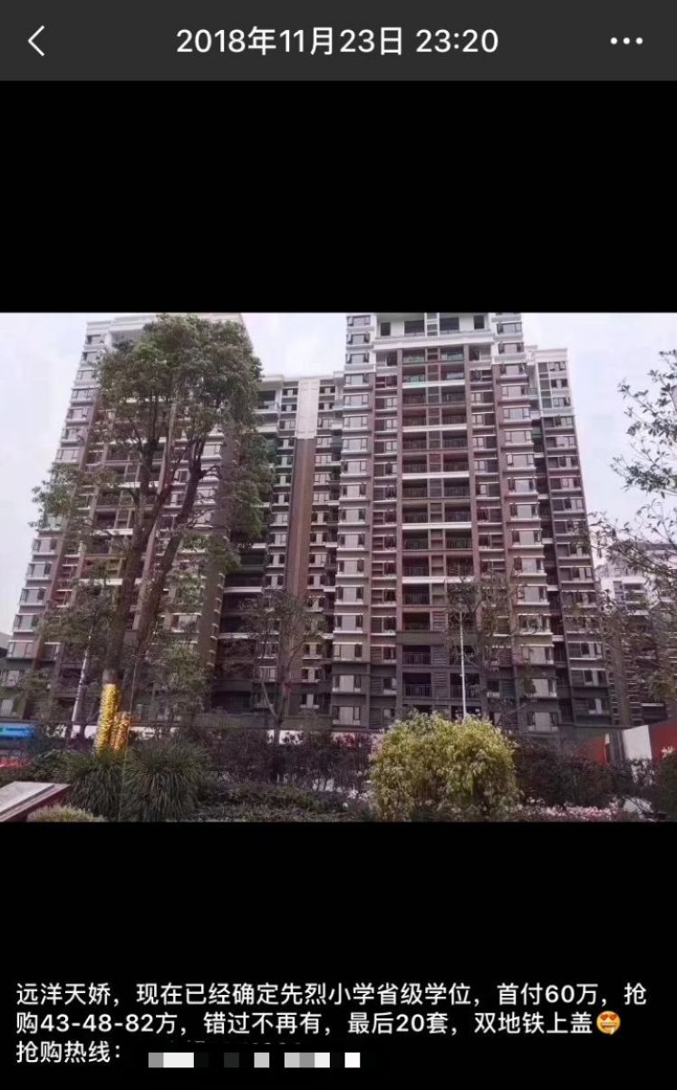 后期,楼盘价格还从4.5万元/㎡,不断上涨到5万元/㎡。这期间,楼盘一直有关于名校的各种宣传。