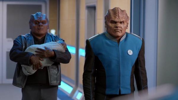 在第一季的第三集,柏图斯孵出来一个女婴,他的伴侣凯尔登坚持要给这名女婴做变性手术。奥维尔号上的舰长船员们齐心协力想要保护这名女婴免受伤害,为此不惜登上莫克勒斯星的法庭与莫克兰人的整个社会进行对抗。《奥维尔号》编剧的高明之处在于,并没有把莫克兰人设定成是简单的邪恶反派,而是对其匪夷所思的社会文化进行客观视角的呈现。舰长艾德在这一集里陷入到了两难境地,一方面出于人人平等、保护生命的理念想要保护这名女婴,一方面又不得不对有文化差异的其他文明保持尊重。保护女婴,会冒犯莫克兰人的文化;尊重莫克兰人的文化,又会眼看着刚出生的女婴被迫改变她的人生轨迹。这一集的结尾既意料之外又情理之中,面对一个已经积习深重的奇葩文明,想要改变它不是一朝一夕的事情。船员们最终不得不选择尊重莫克兰人的文化,放手让柏图斯和凯尔登这对“父母”做出选择。