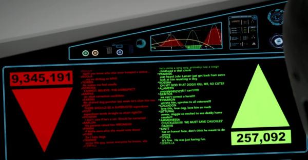 《奥维尔号》这一集显然是对当今网络世界的嘲讽。网络给人类社会带来了前所未有的民主,然而同时又酝酿出了新的暴政。“人肉搜索”、网络暴力这些东西不正是我们这个时代新出现的负面事物吗?在大多数情况下,当所有人通过网络连接成一个整体时,其判断力往往会呈现出低幼化的倾向,感性思维彻底压倒理性思维。奥维尔号船员最后解救约翰·拉玛中尉的方式恰是利用到了这一点。舰上的凯隆星人艾萨克作为一台超级电脑,黑进了这个文明的网络系统,同时给所有用户推送了一段约翰·拉玛中尉爱狗的视频。恰是这样一个看似无聊的小视频,改变了大多数人对约翰·拉玛中尉的态度,于是点赞人数超过了给差评的人数,约翰·拉玛中尉最后被无罪释放。
