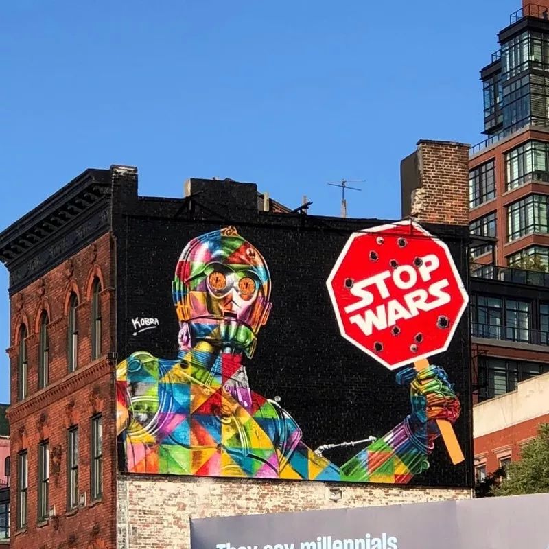 其他的涂鸦也非常有趣,透露出点点幽默,例如对爱因斯坦爱的方程式系列、星际的反战系列、名人政要系列等。