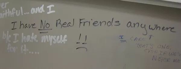 这是最为普遍的一类,大学生们在“青春期”的感情非常细腻、复杂,尤其是女生们,无论是甜蜜还是心酸,厕所正给她们提供了一个发泄的场合。