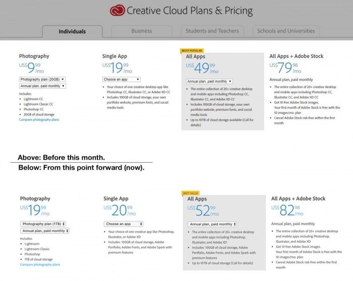 本周之前Adobe的Creative Cloud月订阅计划起步价格为10美元,最基础的“Photography Plan”计划提供20GB的云存储空间,且可以访问Photoshop和Lightroom两款应用程序。不过近期很多用户发现该计划已经被取消调整,而且Creative Cloud单个创新应用的月订阅计划最低起步价格也调整为21美元。