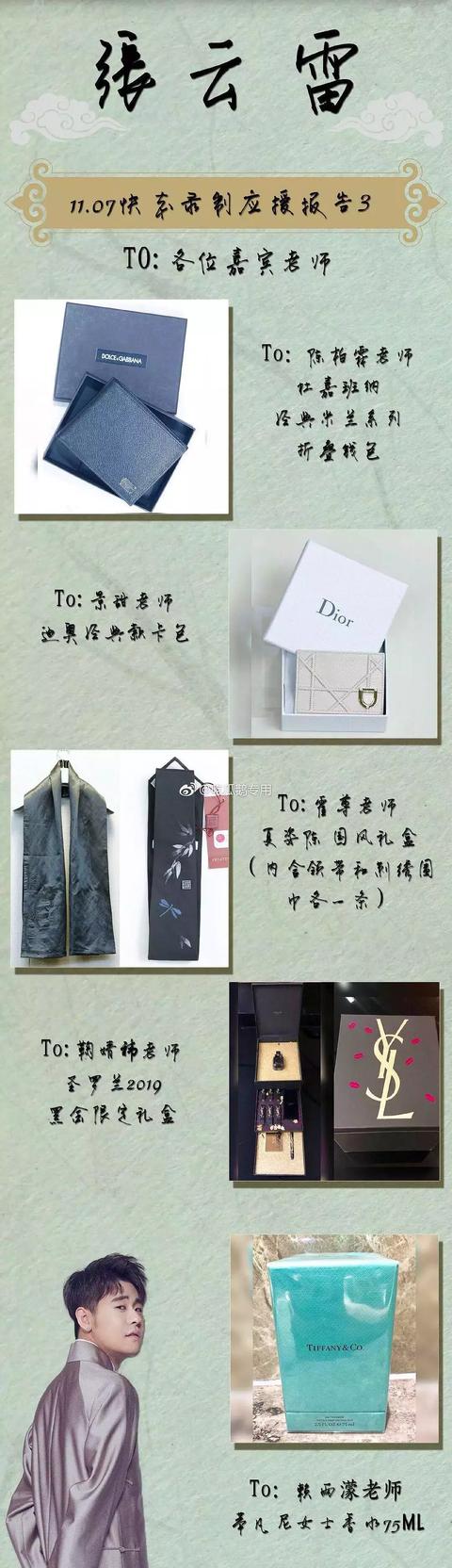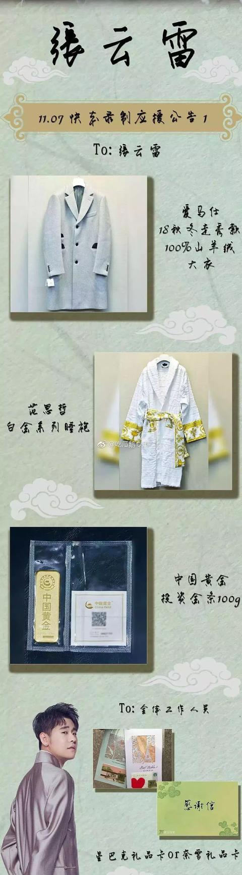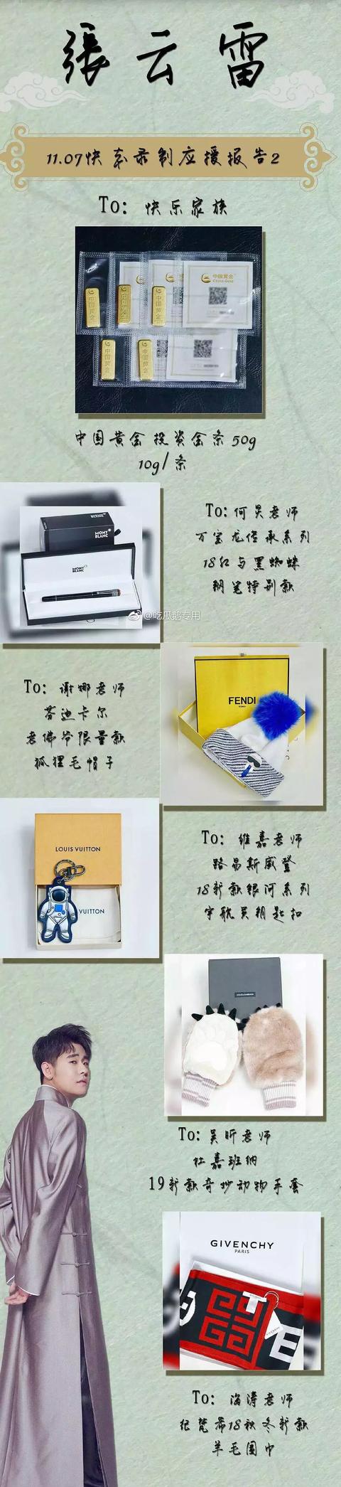 吃的只是基础,其他的还有万宝龙的钢笔、FENDI的帽子,LV的钥匙扣,D&G手套(辱华事件前),纪梵希围巾,以及每人10克金条!!对于张云雷本人,那就更慷慨了!送张云雷本人的是爱马仕羊绒大衣,范思哲睡袍,100克金条。