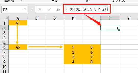 如下图所示,在F2单元格输入函数=OFFSET(A1,5,3,4,2),表示从A1单元格开始偏移,向下偏移5行,向右偏移3列,然后返回4行2列的区域,即下图中D6到E9单元格的区域。因为此处返回的是一个区域,所以输入函数直接按回车会返回错误值,按下Ctrl+shift+enter键会返回区域的第一个值。