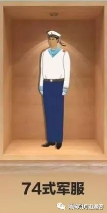 74式海军干部服的军帽改作了类似55式的大檐帽,帽徽仍然还是65式的红色五角星。74式海军战土服的军帽改回了55式的苏式水兵帽,均佩65式的红五星帽徽,帽墙钉一圈黑色飘带,飘带上的文字仍然是简化字“中国人民解放军海军”,但是改成成本较低的金粉印刷,不再使用刺绣,水兵帽上的飘带只围绕帽墙一圈。改佩戴2块全红色的肩章。1976年10月74式水兵帽后的飘带得以恢复。