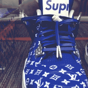蓝白撞色的鞋面印花灵感源于 LV 和 Supreme 此前的联名花纹,后跟浮雕呈现的Jumpman logo也被换成了LV的logo。