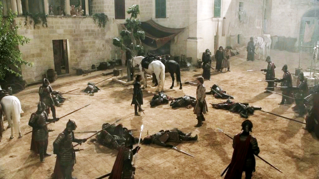 奈德在小指头的妓院前遭到詹姆带队袭击,手下人全部丧命,自己的腿也被刺伤,就取景自姆迪纳古城内的梅斯基塔广场。