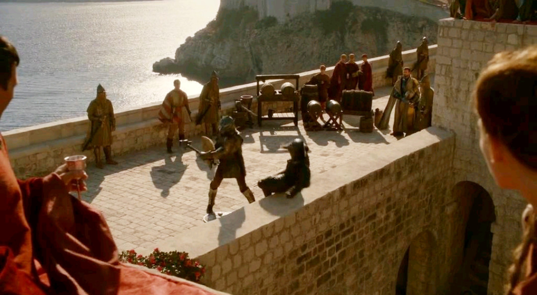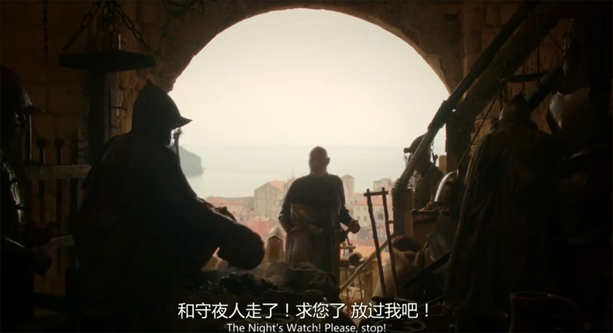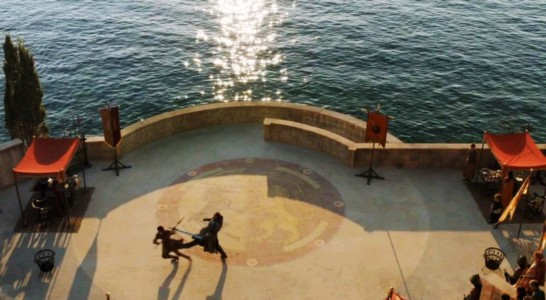 金袍子在君临城搜捕劳勃国王的私生子,在钢铁街逼问铁匠师傅詹德利的下落。这里的钢铁街就在明阙塔塔顶取景。背景便是杜布罗夫尼克古城整片的红色屋顶,以及远处的亚得里亚海。