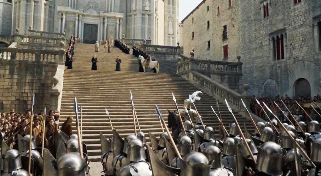 詹姆带兵到贝勒大圣堂前以武力威胁大麻雀,却发现玛格丽和托曼已被洗脑,只好尴尬退兵。这个场景就拍摄于西班牙的赫罗纳大教堂前宽阔的台阶和小广场。