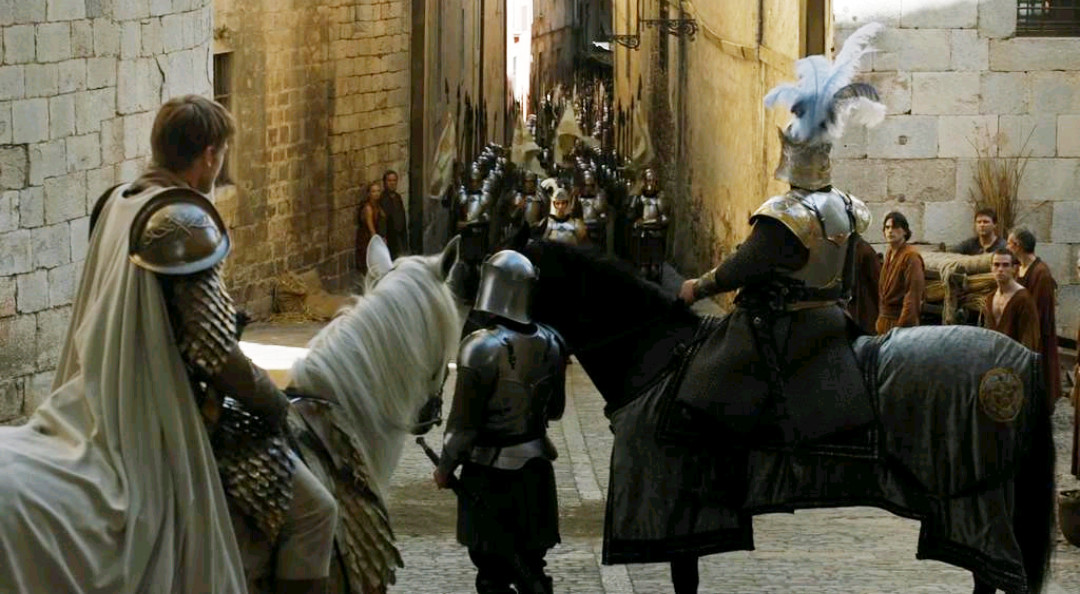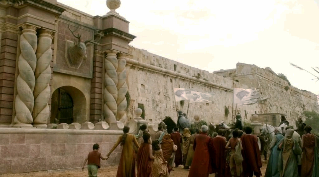 奈德带着两个女儿进入君临城,接任首相。奈德的车队浩浩荡荡从君临城门进入。这里的君临城门,拍摄地在马耳他的里卡所里堡。剧中门上方加了一个象征拜拉席恩家族的巨大鹿头。