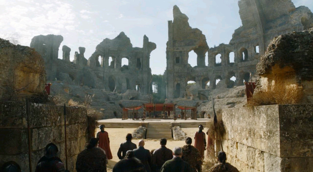 丹妮莉丝、瑟曦和琼恩在君临龙穴中举行三方会谈,谈判休战并共同应对异鬼大军的提议。三方会谈举行地就在意大利加城的古罗马竞技场遗迹中拍摄,当然还有一些后期的特效。