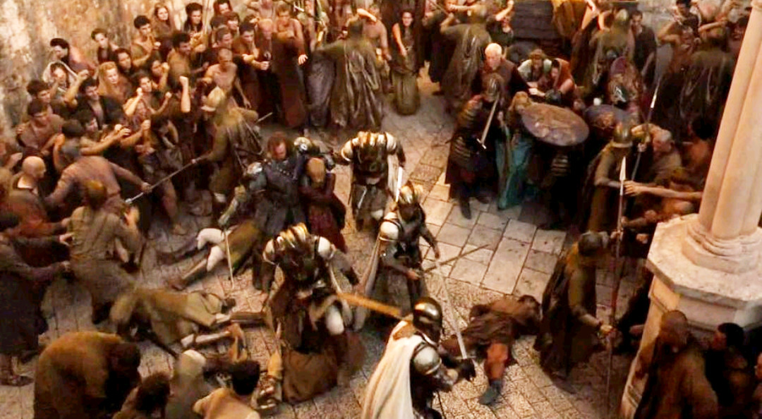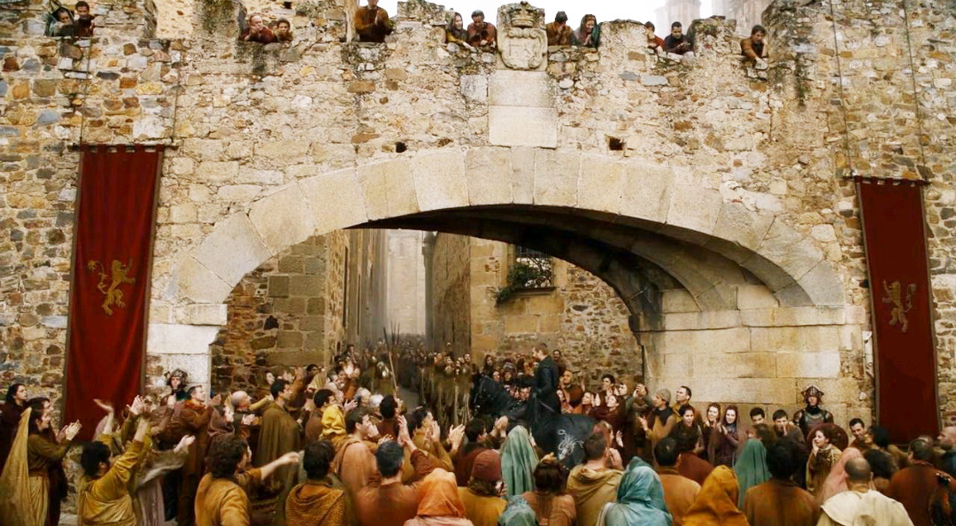 乔佛里等王室一行人从君临码头边送别弥赛拉,返回红堡的途中遭到君临暴民的袭击。君临暴乱拍摄于派尔城门的内城门。