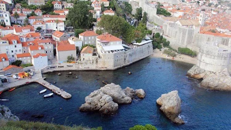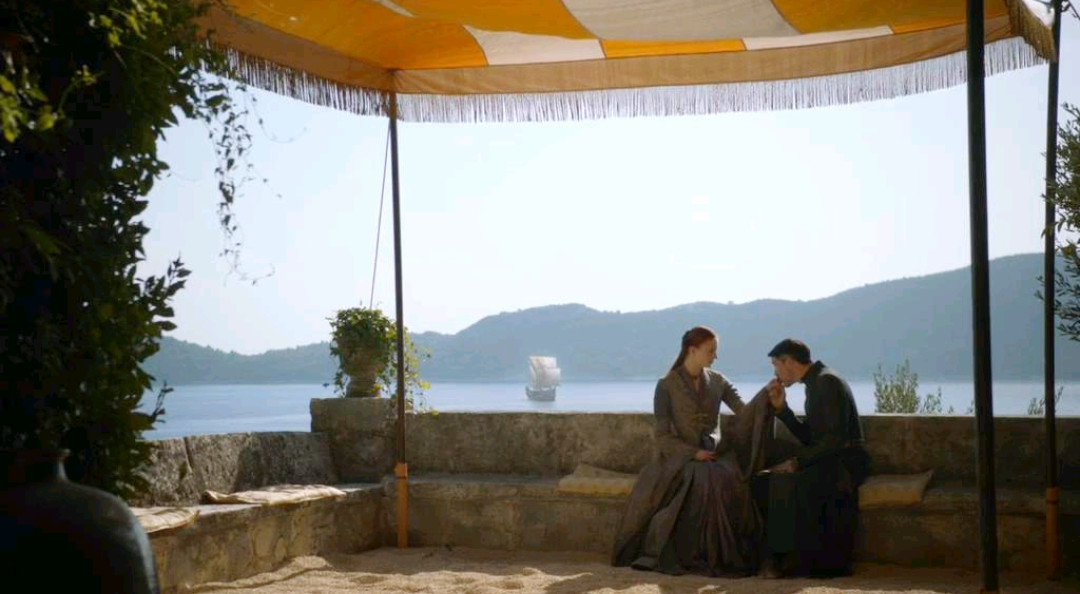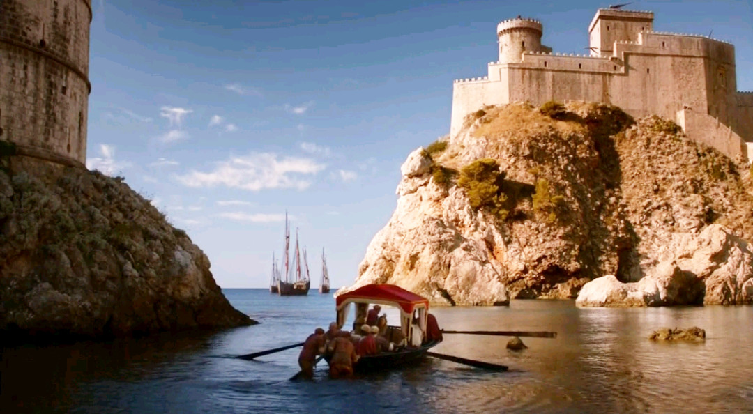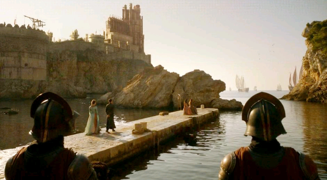 这里的君临码头就是克罗地亚杜布罗夫尼克古城西侧的派尔码头。画面左侧为古城的博卡尔堡,右侧是圣劳伦斯堡。之后瑟曦到君临码头迎接弥赛拉归来,却只见到女儿的尸体,也在此地取景。