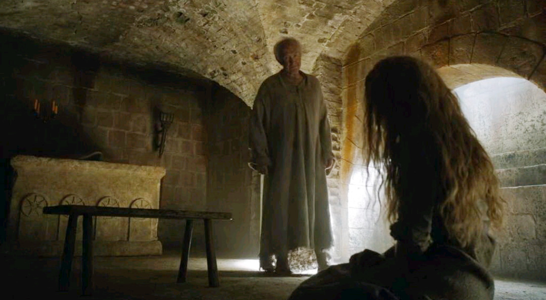 托曼到大圣堂地下室拜访大麻雀,请求容许瑟曦探望弥赛拉的长眠之地。