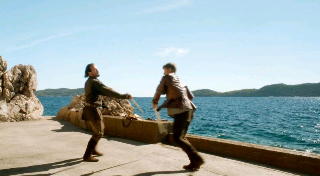 小码头位于特斯特诺植物园南部海边,詹姆请求波隆陪他练习左手用剑。两人练剑处就在小码头东侧空地上。
