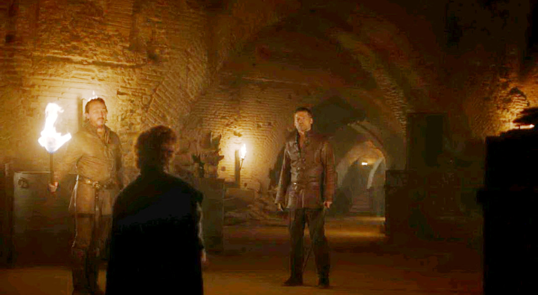 波隆假称陪詹姆练剑,带他进入君临龙穴,秘密会见潜入君临的提利昂。提利昂向詹姆通告了夜王进军东海望的消息,提出双方休战。