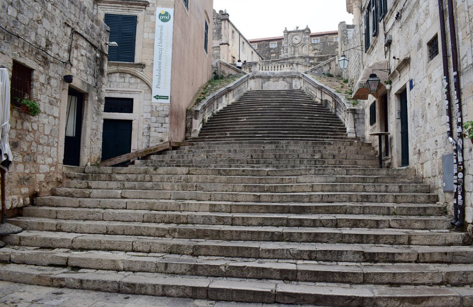 贝勒大圣堂前的台阶,是杜布罗夫尼克古城中通往圣依纳爵教堂的石砌台阶。仅有这段台阶是实景拍摄,画面远景中宏伟的贝勒大圣堂主体建筑,是后期添加。