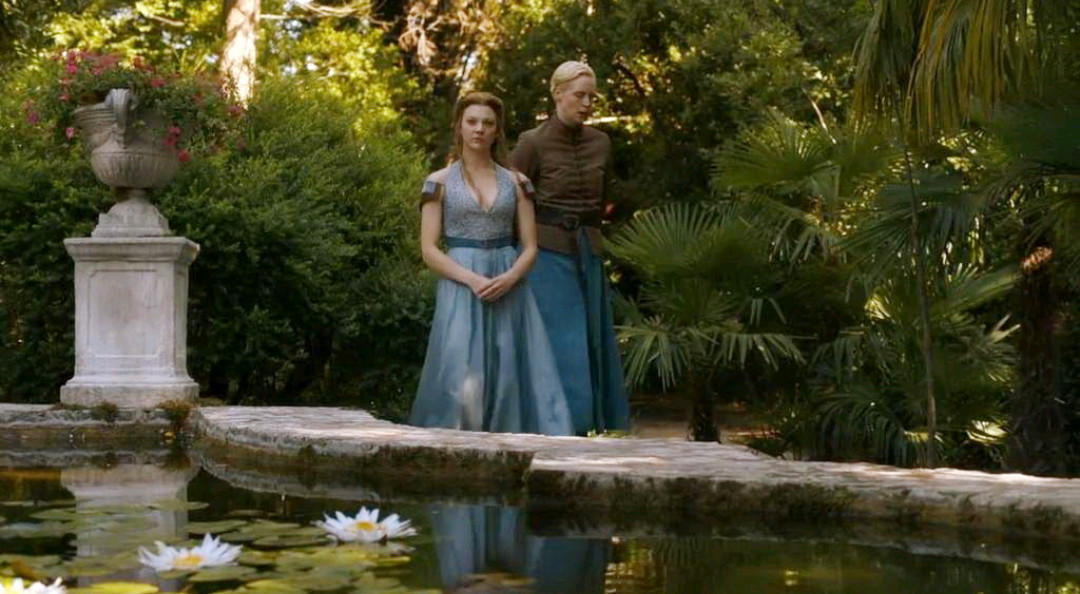 奥莲娜和瓦利斯在红堡御花园中散步交谈。两人经过园中古老的高架引水渠,随后走入中央林荫道。
