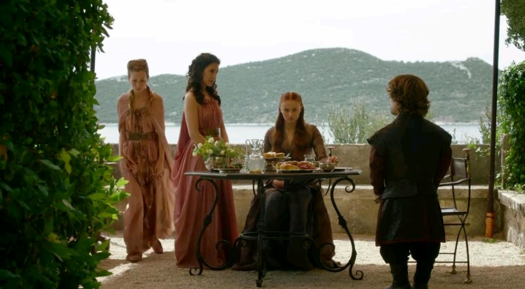 在提利尔家的安排”下,洛拉斯开始不情不愿的和珊莎约会,二人就坐在罗马喷泉边。