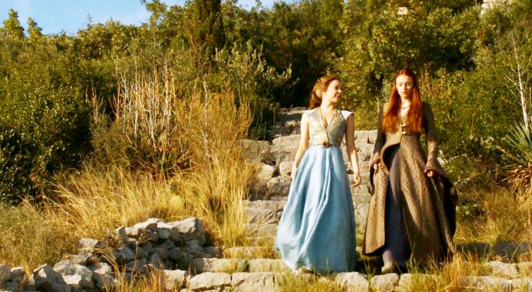 珊莎与洛拉斯在红堡花园一同散步,随后和玛格丽在凉亭会见提利尔家的“荆棘女王”奥莲娜。