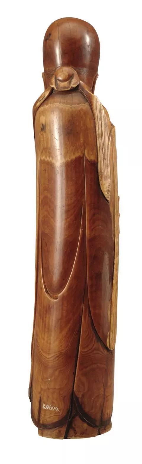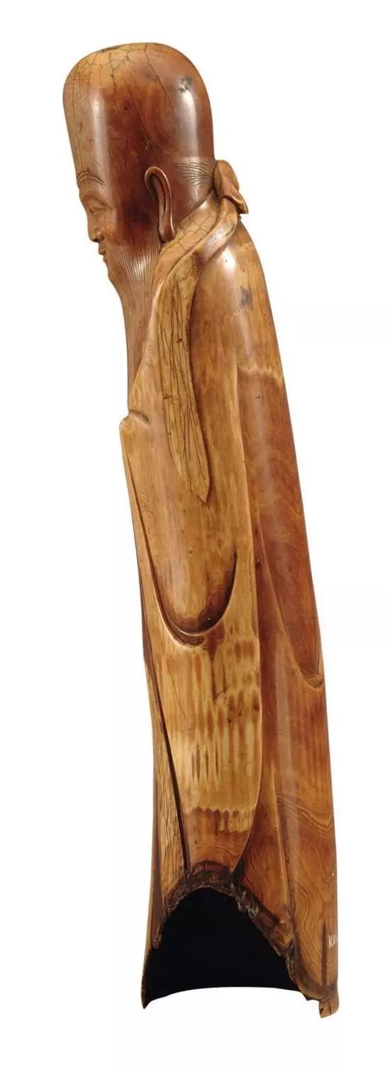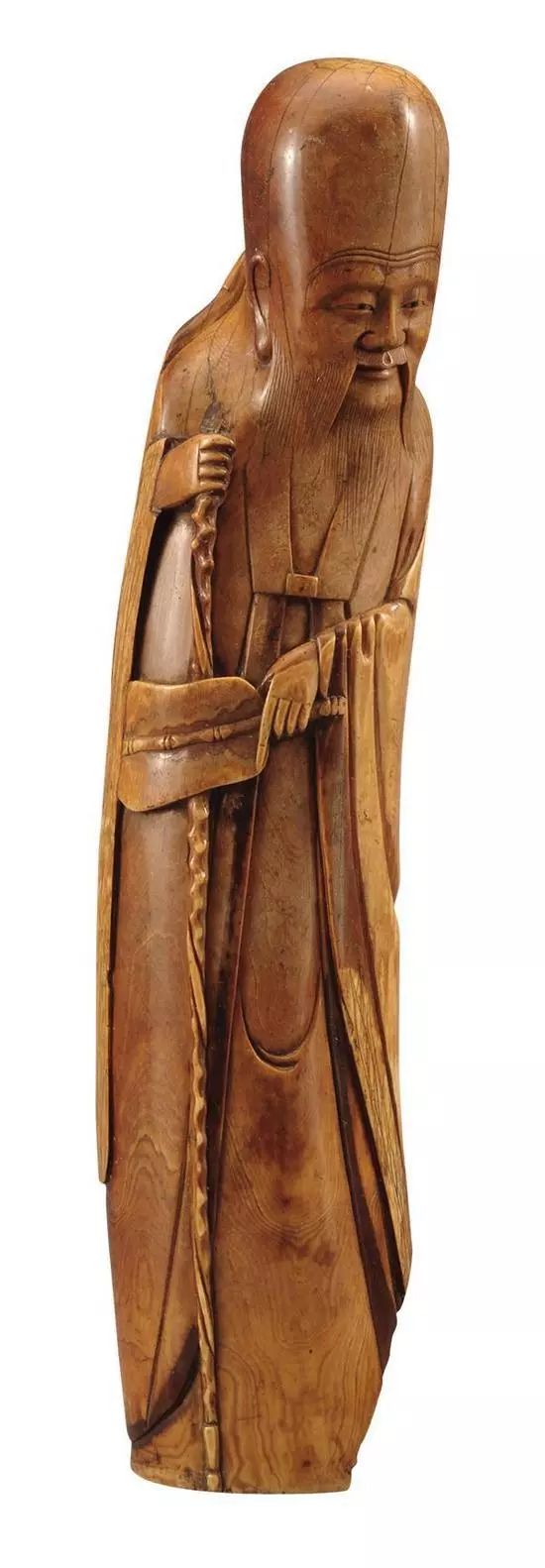 此件宽6.5厘米、通高24.5 厘米,为本馆二级藏品。寿星依象牙形状和纹理雕刻,头形细长,微凸,高额耸立,长眉弯垂,目微睁,阔鼻垂耳,长须及肩,面容慈祥,略带微笑,身着对襟宽袖长袍,手持一杖。寿星雕工虽然不复杂,但是线条十分流畅,面容雕刻尤为突出,那微微一笑仿佛能够穿越时空,直达人心。在道教中,寿星称为南极仙翁或南极真君。在明代嘉靖、万历时期,由于皇帝非常崇尚道家,许多工艺美术品为道教人物形象或装饰上都弥散着极重的吉祥如意的氛围。