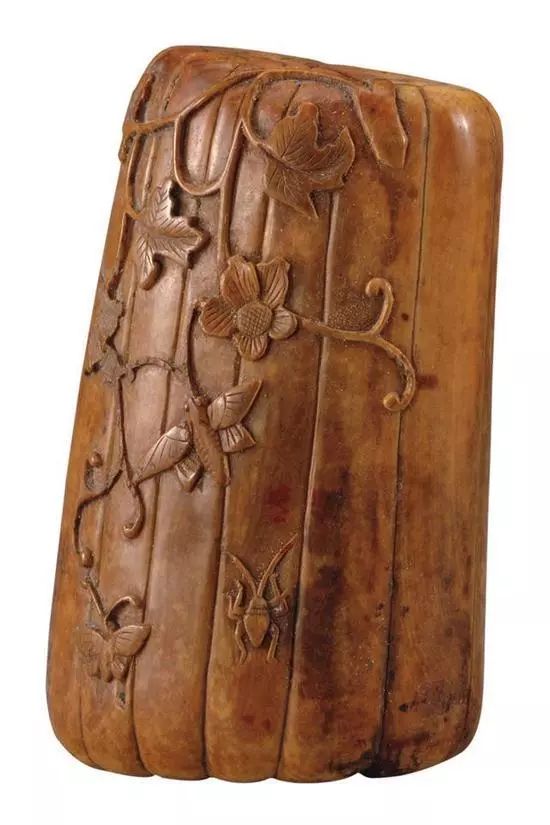 另外,减地浅刻工艺在象牙雕刻制作中并不常见,上文所介绍笔筒采用该工艺,未减地的部分加以抛光,减地的部分利用刀具留下的刻痕及象牙自然的纹理表现纹饰内容,古拙清雅,别具一格。