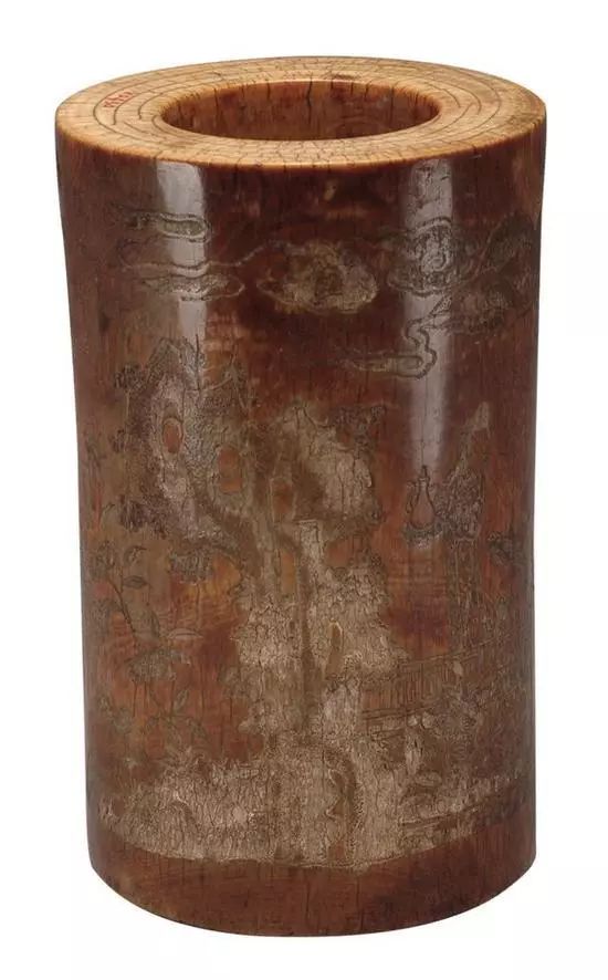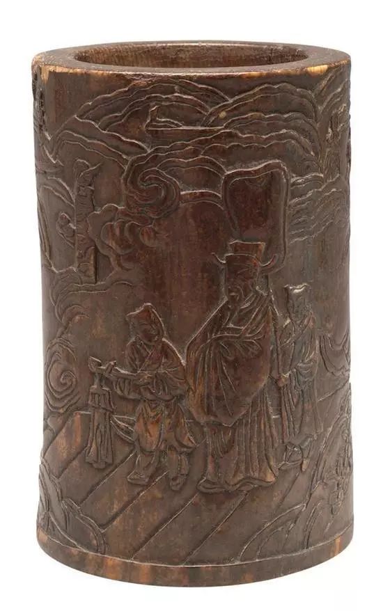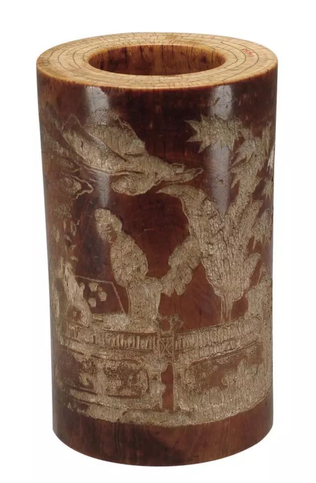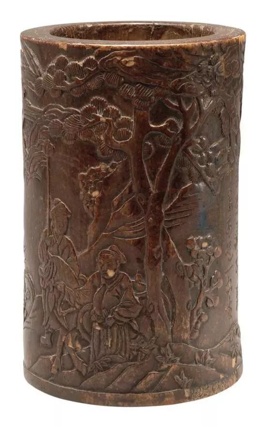 此笔筒剔地浅浮雕和阴刻线修饰的手法雕刻画面,人物面部处理很简练。晚明时期,山水人物图是一种十分流行的纹饰,充分表现了士大夫纵情山水的闲情雅趣。苍松、梅花为“岁寒三友”中的两友,松象征常青不老、梅象征冰清玉洁,皆是君子所寄求。