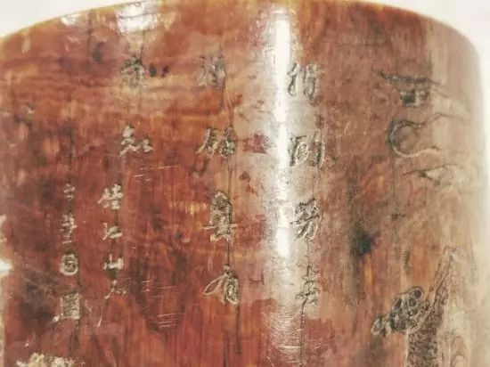 蝴蝶在采花蜜,天空飘着云朵,远处群山隐隐可见,一派宁静悠闲的感觉。在笔筒上端一侧刻有诗句及题款,诗句内容为“独酌芳春酒,余兴有谁知”,落款“镗江山人”。诗句内容与人物故事图内容遥相呼应,更添潇洒悠远之感,与明代文人气质完美契合。
