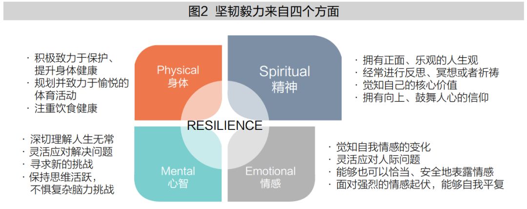 一个人的坚韧毅力来自身体、心智、情感、精神四个层面(见图2)。