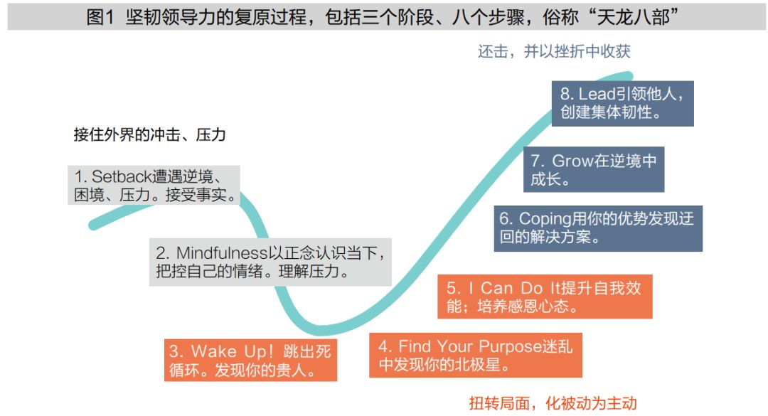 坚韧领导者善于在压力下迅速恢复、复原反弹到正常状态,并从中提升自我、引领追随者。这个过程犹如太极以柔克刚,经历了接、转、还三个阶段里的八个步骤,我们权且称其为“天龙八步”(见图1)。