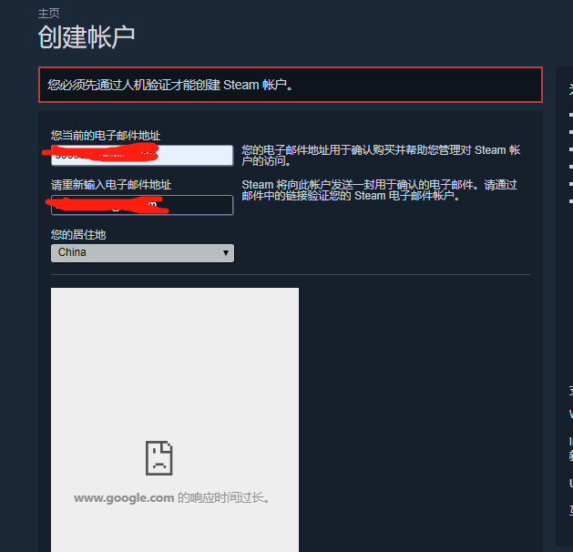 听到这一消息,我们立马去尝试注册一个Steam来进行测试。从下图中我们可以看到,在使用大陆IP打开注册页面时,谷歌验证框根本无法显示,报错“www.google.com的响应时间过长”。即使点击提交也会提醒“您必须先通过人机验证才能创建Steam账户”,目前V社暂未就此作出解释,也没有针对国内玩家提供解决方法。