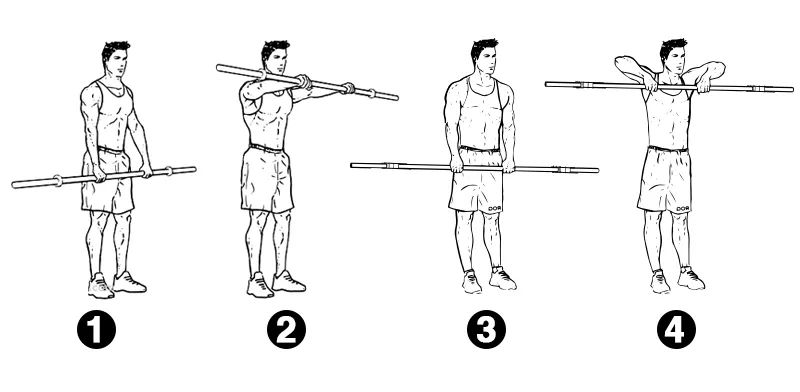 比如说你需要前平举杠铃至你的肩膀高度,动作在顶端短暂停顿后下放杠铃,待杠铃回到起始位置,紧接着要做的是直立划船,这样合起来称作一次动作。