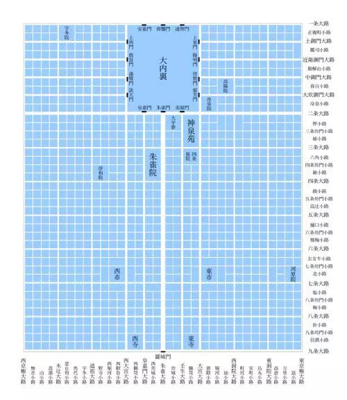 而这一点,一样被日本人学去。奈良时期,就已经佛法兴盛,到了迁都京都之后,日本的佛教达到了巅峰。京都的道路,横的叫做条,竖的叫通。条和通之间分割的小方块,不叫“坊”而叫“町”。