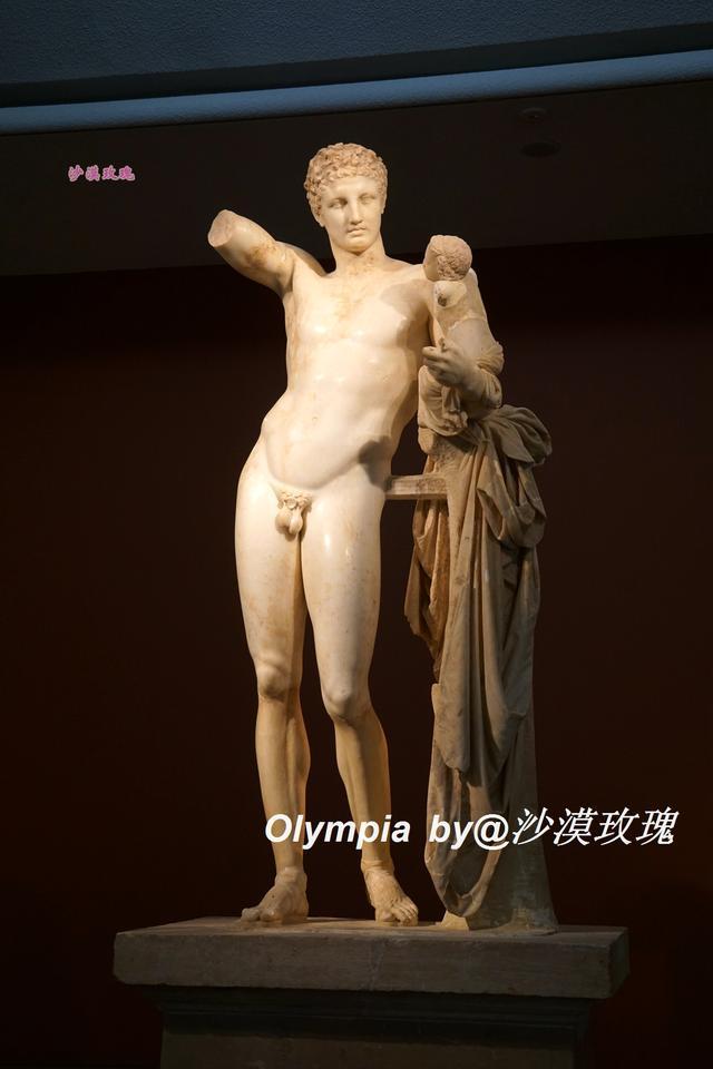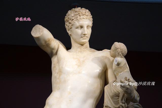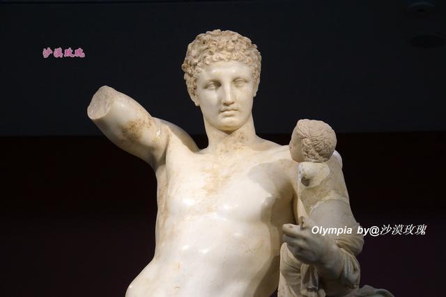 这座雕塑堪称博物馆的镇馆之宝——普拉克西特列斯的赫尔墨斯(Hermes of Praxiteles),它由古希腊最杰出的雕塑家普拉克西特列斯于公元前330年所雕刻,又名《抱幼童酒神的赫尔墨斯》,体现了古希腊雕塑难以超越的艺术高峰。它由产自帕罗斯岛上的大理石雕刻而成,商业和交通之神赫尔墨斯抚养他同父异母的兄弟酒神狄奥尼索斯,他举起的右手可能拿着一串葡萄,赫尔墨斯被刻画成文雅健美的美男子。