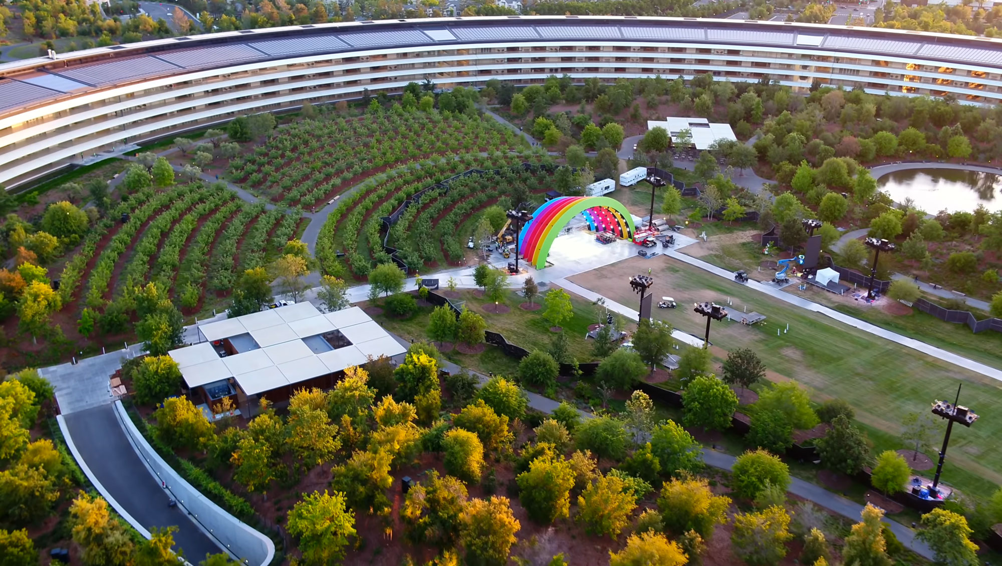 苹果在今年早些时候悄然开始在环形主楼中央场地搭建彩虹拱门舞台,若不是无人机光顾,该项目可能一直都不会被外界知晓。该舞台是为 5 月 17 日的员工特别活动准备的,有两个目的:一个是庆祝 Apple Park 园区正式全面启用,另一个是向乔布斯致敬,因为是他概念化了 Apple Park 环形主楼的太空船造型设计。