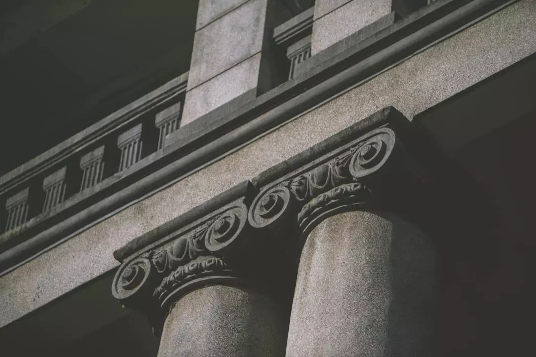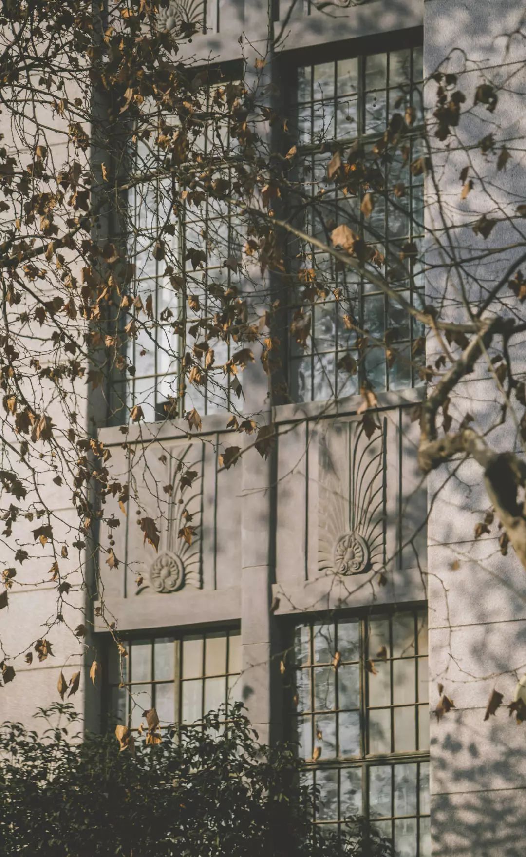 它是现代风格与古典主义糅合的产物,采取典型的三段式。第一段三层,竖着6根廊柱。廊柱的布局十分别致,两边各一根,中间两处为两柱并联,使整个门面显得尤为生动。