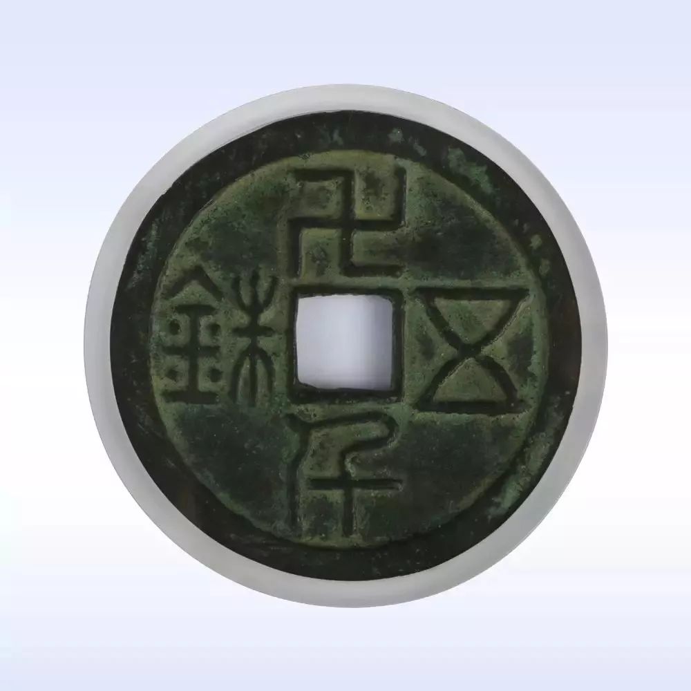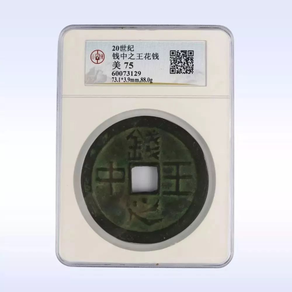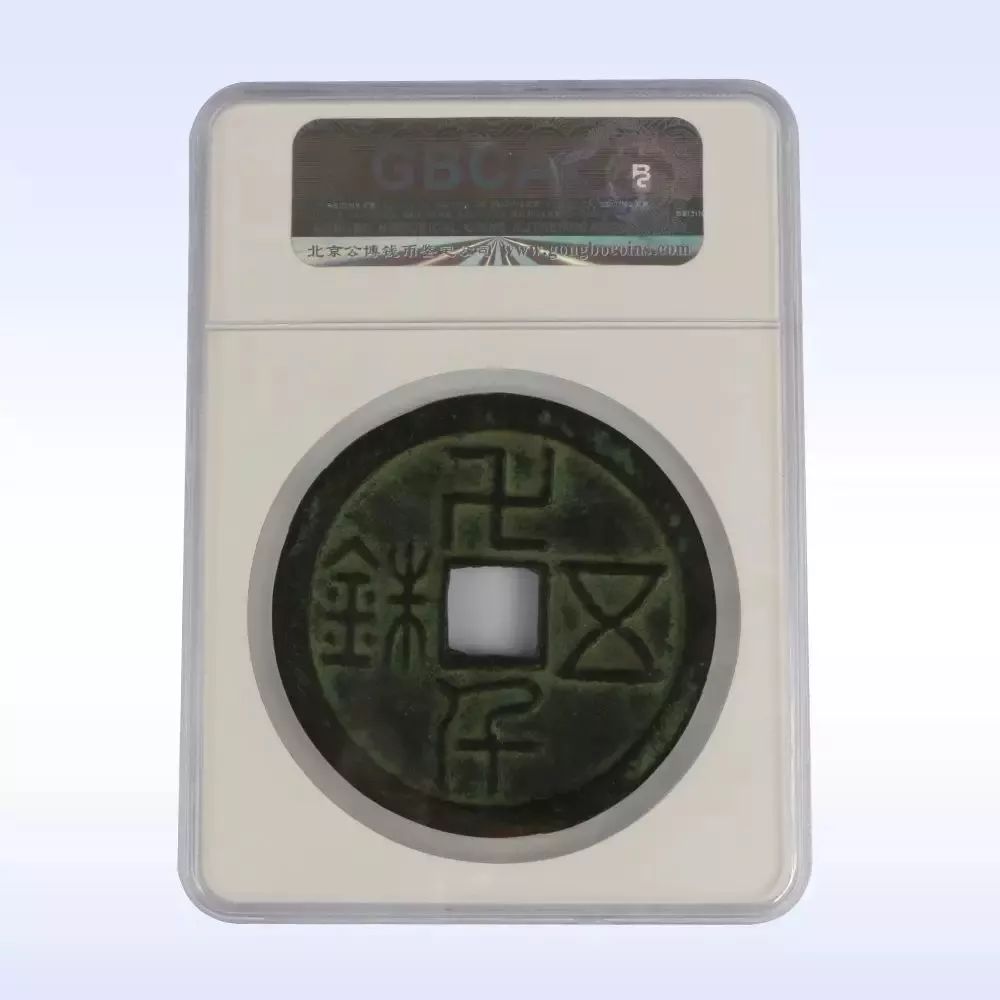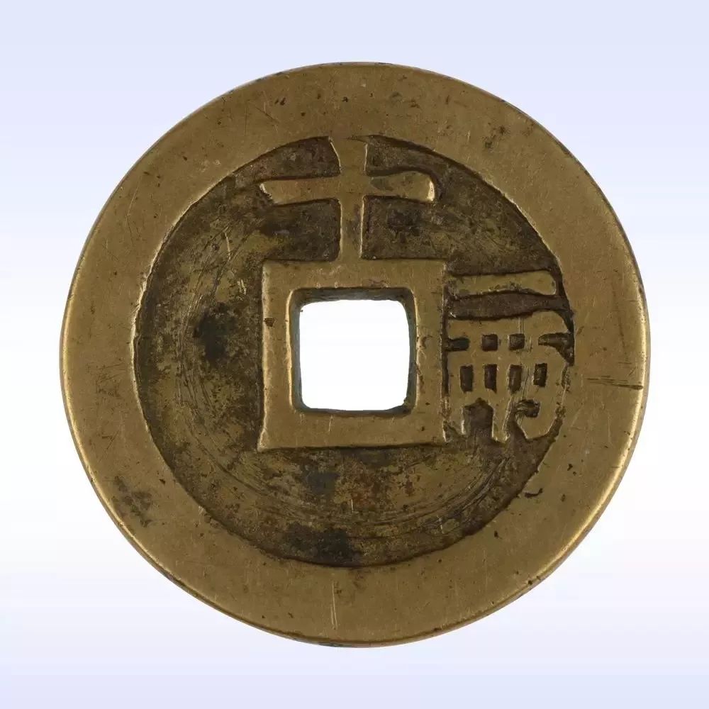 介绍:钱中之王 背 万千五铢;青铜材质,直径73.1毫米,此品工艺考究,铸造精美,穿口方正,地章扳平,钱文字体虽浅但锋利犹存。面文“钱中之王”为上、左中、下之、右王,逆时针旋读。背文“万千五铢”为上卍、下千、右五、左铢,上下右左直读。文字书写工整规矩,笔法苍劲,隶楷篆皆有。通体红斑绿锈,沧桑感十足,极美品!