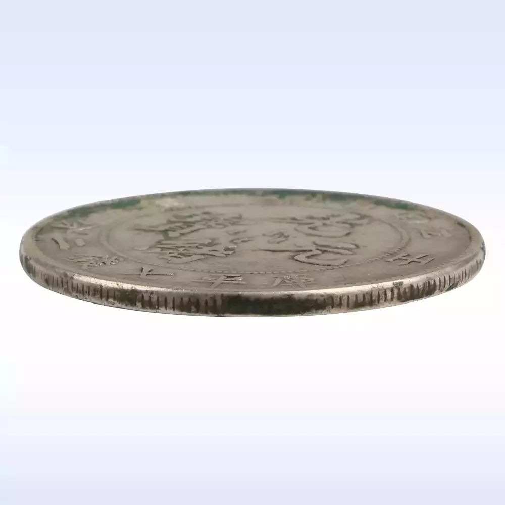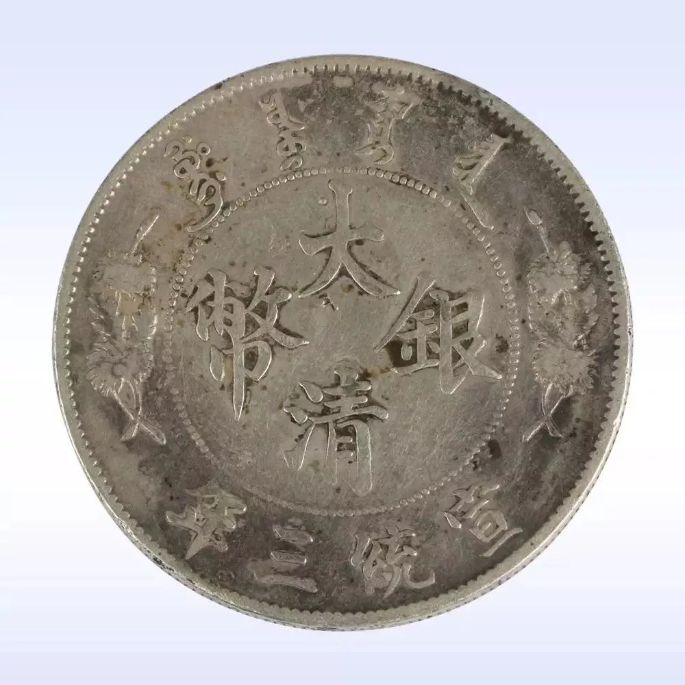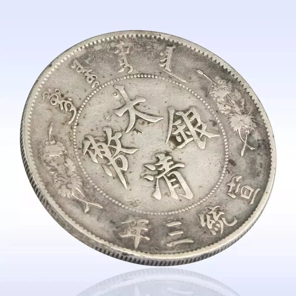 介绍:大清银币,铸于宣统三年(1911),户部造币总厂制造。该厂设于天津,生产宣统三年大清银币有多种式样,其中进入流通领域的大清银币只有曲须龙一种。正面中文“大清银币”,外圈围上4个同义满文,下有“宣统三年”,左右分列长枝大花饰。背面“壹圆”,外围龙纹,下有英文“ONEDOLLAR”。