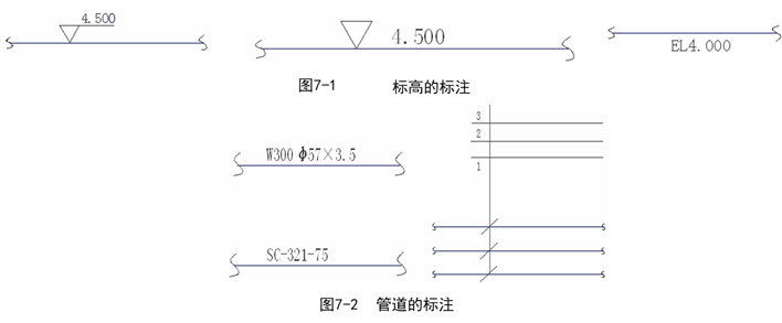 •管道安装标高均以m为单位,以室内地面±0.000为基准,管道一般注管中心线标高加上标高符号,如▽4.500。必要时也可标注管底标高,如“EL4.000”,见图 7-1。零点标高注成±0.000,正标高前可不加正号(+),负标高前必须加注负号 (-)。
