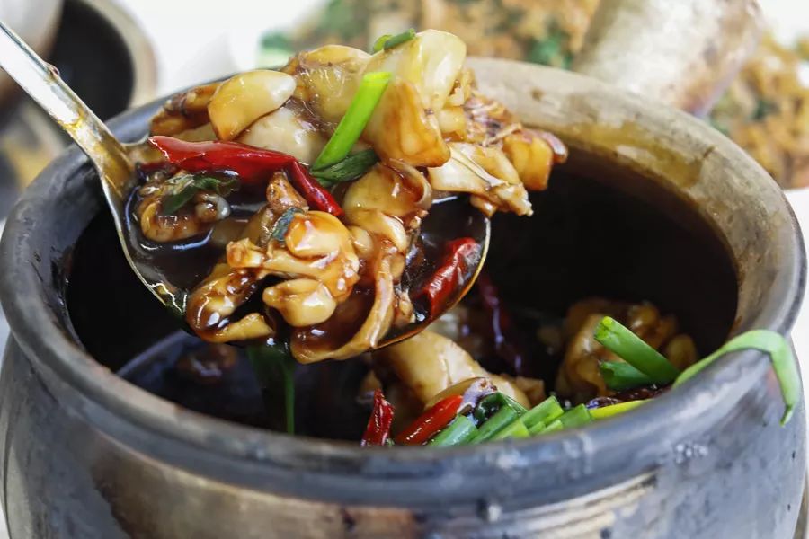 辣味用干辣椒和深色甜酱油烹制