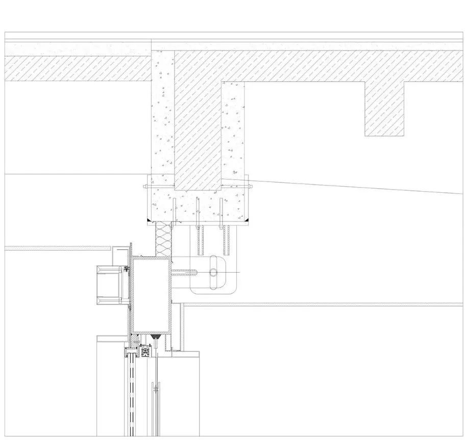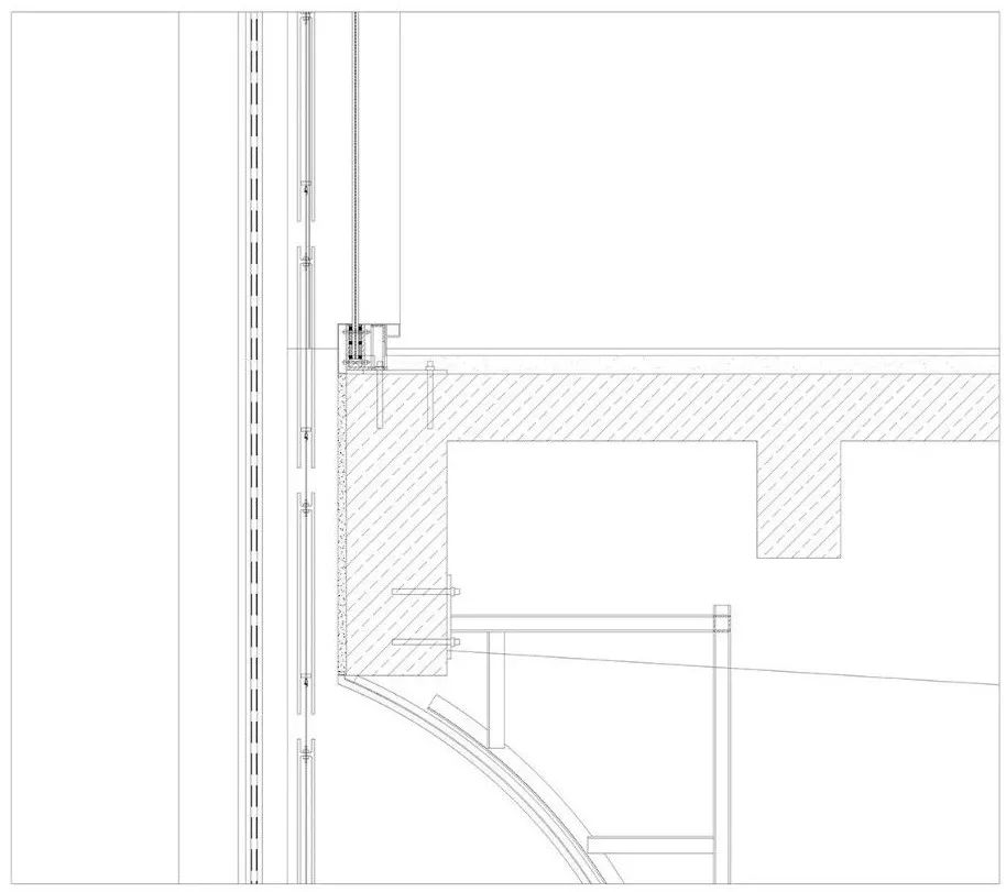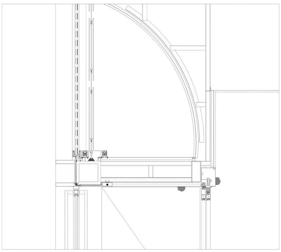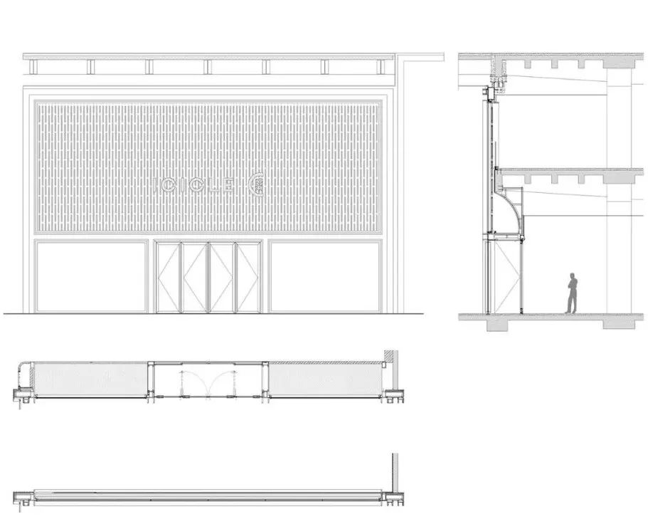 店面幕墙为自身承重钢结构,支撑结构被隐藏于煤黑色金属框架表皮之后,从而实现了橱窗玻璃幕墙面积的最大化。幕墙由六组三层夹层安全玻璃构成,厚50毫米,高5.4米,可承担钢框架以及帷幕钢索悬挂荷载。