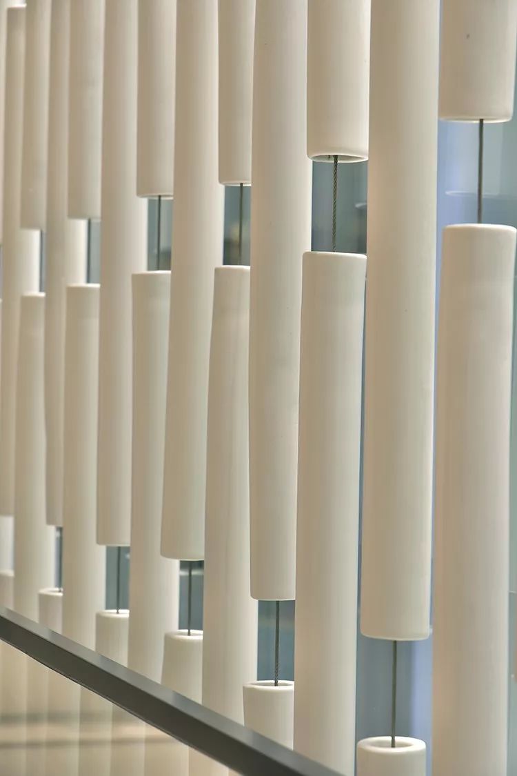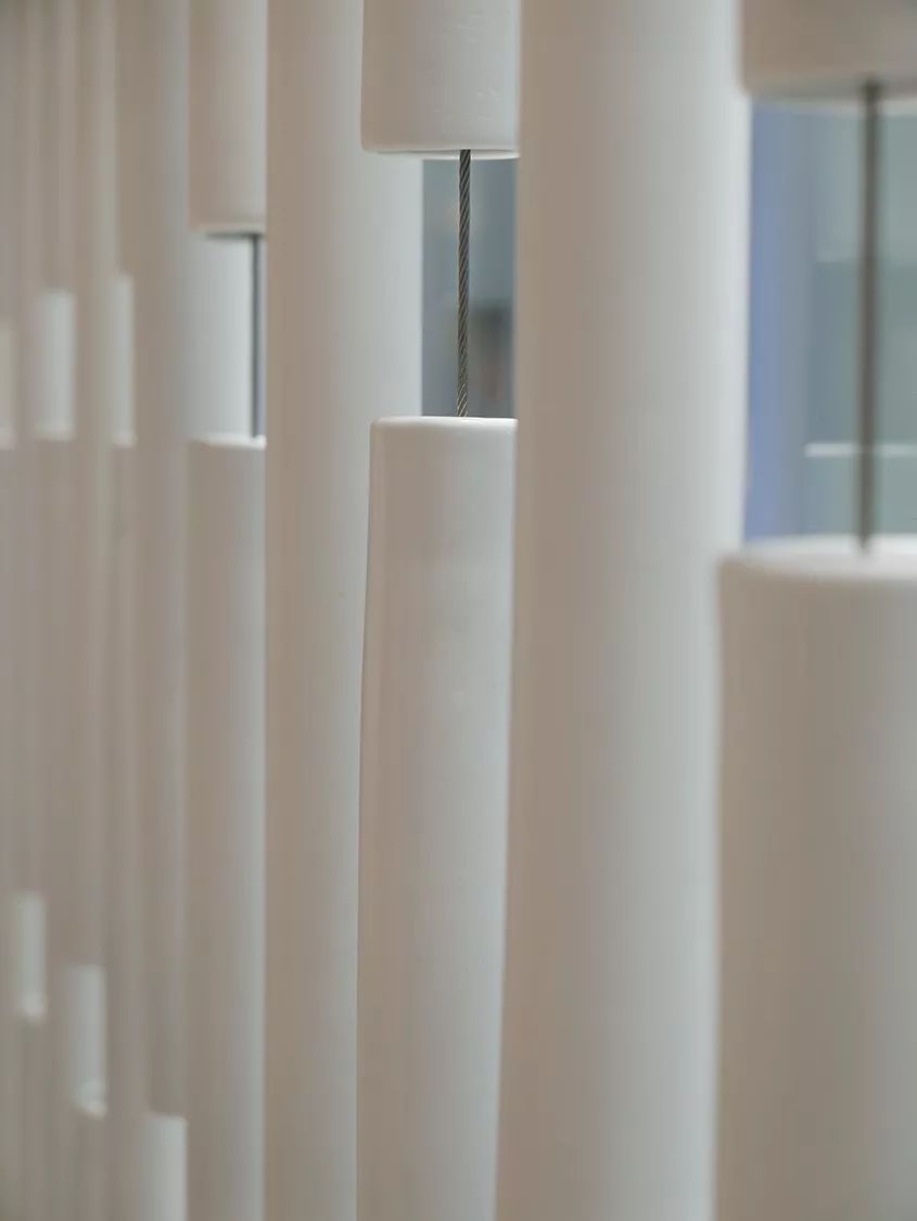 陶瓷管由中国陶瓷品牌spin提供,全部在景德镇遵照传统工艺手工制成。它们由白瓷制成,手工涂抹上釉,烧制完成后表面呈现柔和哑光色泽。每个陶瓷管形态以及釉色之间的微小差别强调了手工作品的天然朴拙。黑色ICICLE标志位于帷幕正面的中心位置。